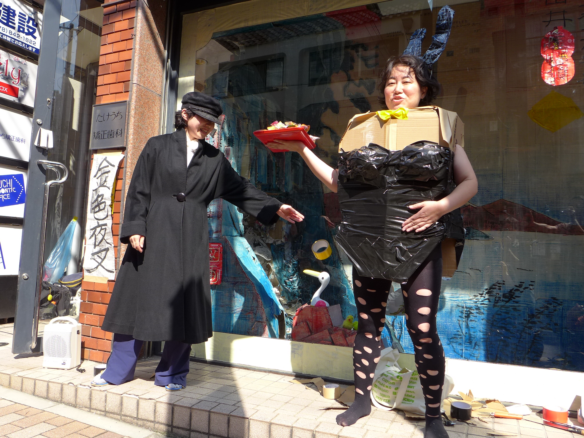 ウインドウの東海道の広重の風景が見事に立体化されて、流石と「力」あるとみている。眼の前で潰れていくのは、僕はケチやさかい勿体無いと思った。しかしそう云う設定なのかと、心を入れ替えて見ていると、今度はウインドウの前で岸川のお宮役に、ダンボールの箱を貫一役の岡本和喜がいろいろとお客の前でBODYを加工していくので、どうなるのかと見ているが、そのプロセスから何が出現、どうなるのかというのが解らなかったので、その解らない問のプロセスが掴めないのが面白かった。と云ってもその結果を見てから解るのであるが、とても大きな時間を僕は感じたのと、このようなプロセスの中でも、その事がわからんと云うのがよかった。