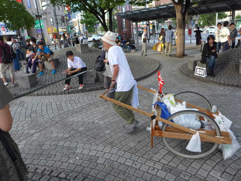 この日の事は、前々から考えていたことであるが、ある日、水垣尚さんがリヤカーがあるというので、リヤカーを借りる話がまとまり、トントン拍子に9月20日を迎えた。無責任な言い方で、ただ「リヤカーを用意てくれ」と頼み、しかも43号線を歩くことだけを言ってのGOであった。そんなことで、口から出まかせは言ったものの、万一迷惑を掛けるような事になってはいかんので、ちょっと前から聞いていた、ミトコンドリアと言う耐久力を作る歩き方で準備はしていた。しかしヨメはんにこの話をすると、一足とびな言い方で「病院に入り」と言うし、前日には保険証を持参するようにマジ言われる、といった事があり、心は増々鬼のように燃えていた。