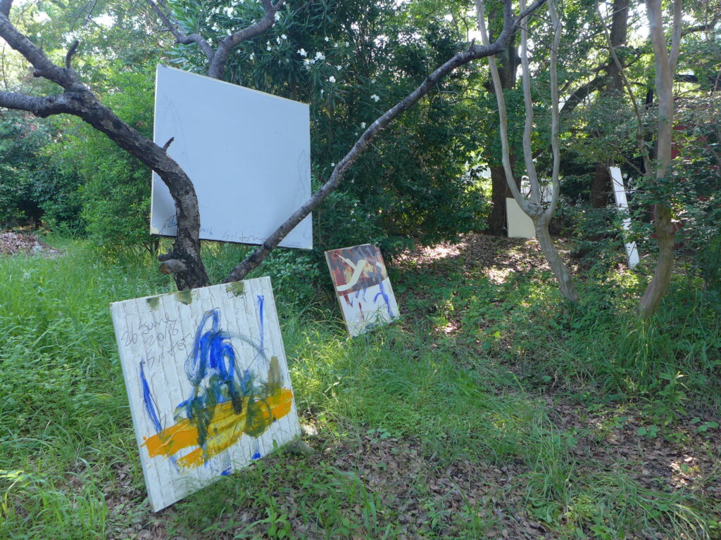 第一ラウンドを2月にして、第ニラウンド(3月)に入って、奈良額田部(喜多画廊)の広い野原のような所にキャンバスを千号ではないが、とにかく枚数を沢山並べて必死でやっている時、そこヘハチが飛んできて首筋の半年に渡るヘルペスの痛いところに刺された。それを一時治療して、一息入れて又再制作と云うか作業していると、2回目もヘルペスの残る右眉間にチクリとやられたが何と不思議、そのおかげでヘルペスがよくなって、キツネにつままれた、とよく言うけど嘘のように腫れもなく気持ちが良かったので、今だいぶん時間が経って、あれは何だったのかと思っております。