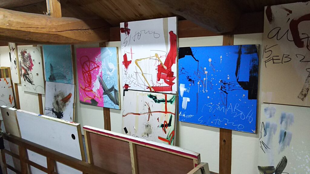 やりだすと量との対決もあり、制作の方法や発想の転換を柔軟に考えていかないと、物量的に時間的にも気力が萎えてしまう。ここのところが一番鍵になるところだったと思った。まず、いいものとか人に見せるとか、見てくれ と云うものを度外視してしまうこと、方法を考える。モノタイプとかドロッピングとか燃やすとか、材料との出会いやその材料の在り方を変幻自在に、物と対決しそれに絵をつくると云うのでなく、つぶす事をためらわず絵の中に入って、その時間の中で自分が培った方法(一分打法)で、ぶちまけ続けていった。自分の意を離れても出来るモノをよしとする。そう云うものをやりきり、今までにない充足感があった。